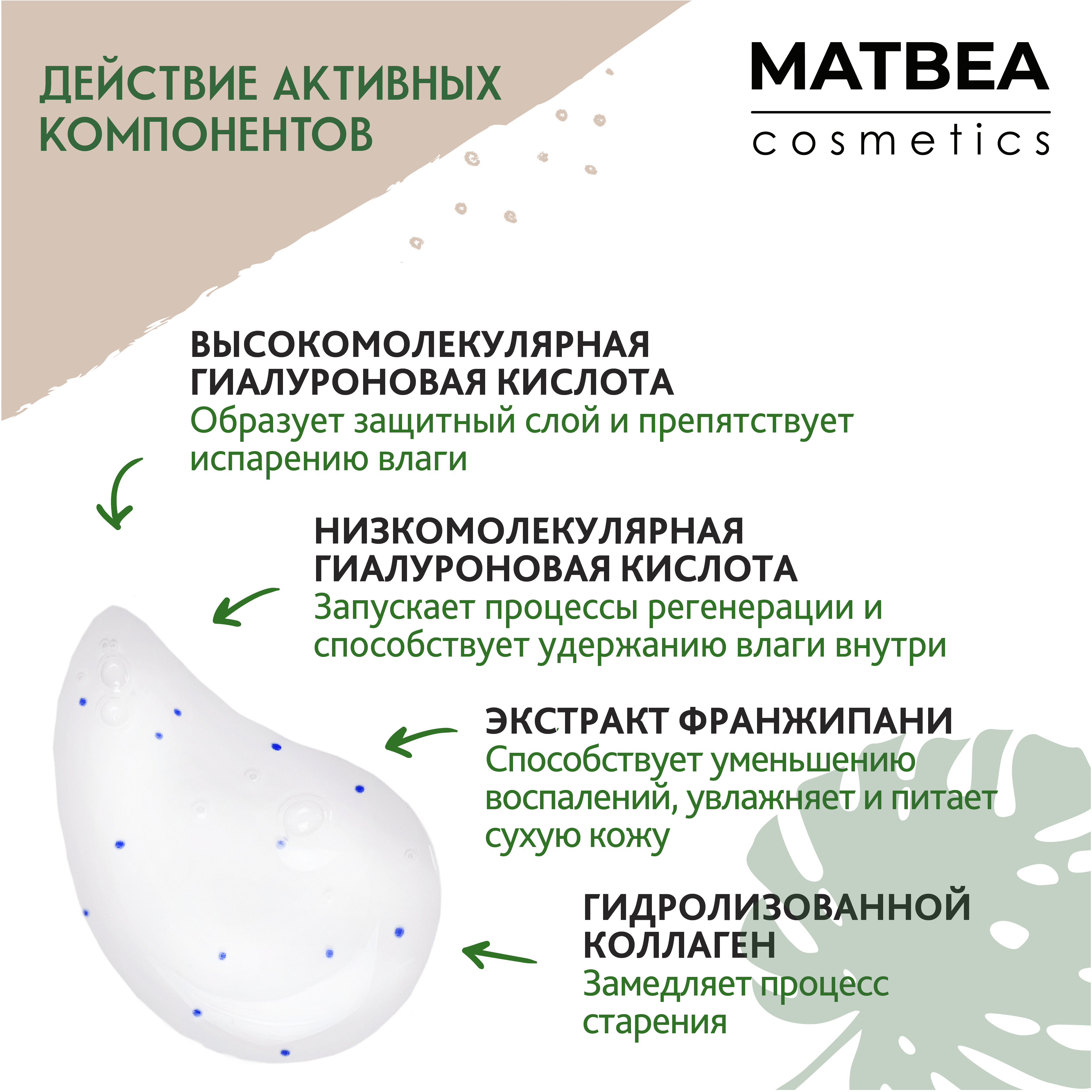 *ВЫСОКОМОЛЕКУЛЯРНАЯ ГИАЛУРОНОВАЯ КИСЛОТА, оставаясь на поверхности кожи, регулирует водный баланс, заботится о её упругости, отвечает за процессы восстановления внутренних слоёв кожи. Выполняет функцию проводника для витаминов и микроэлементов при отсутствии активной микроциркуляции в некоторых зонах эпидермиса.